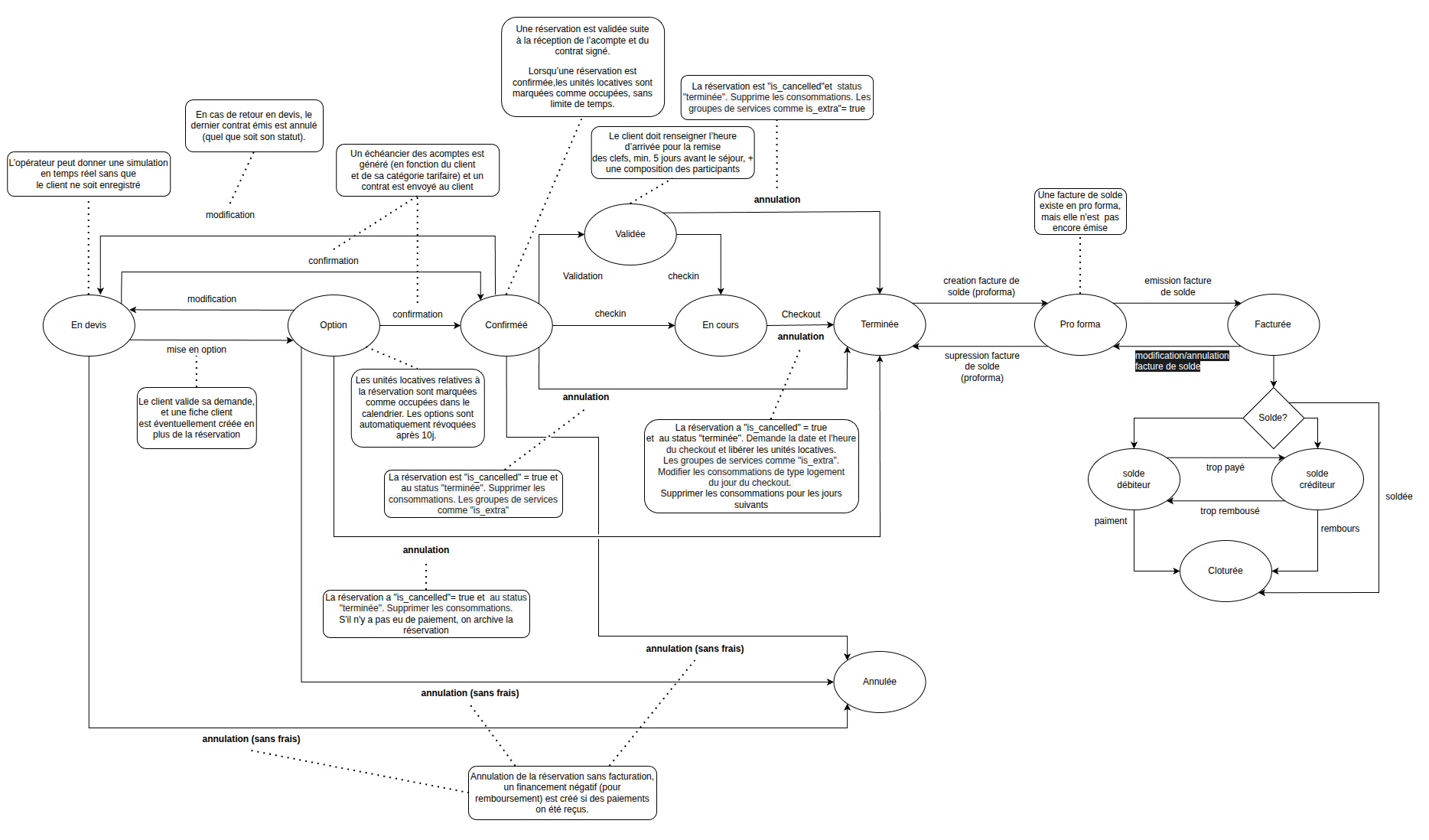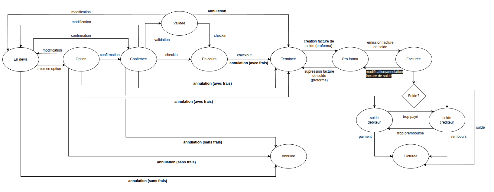 Lors des passages successifs aux différents états, des actions automatiques sont exécutées. En ce qui concerne le planning : ce sont les consommations qui déterminent les occupations des unités locatives, il s'agit donc d'éléments très sensibles qui ne doivent être modifiés avec prudence. Les consommations sont créées lors de la mise en option (ou de la confirmation en cas de confirmation immédiate).